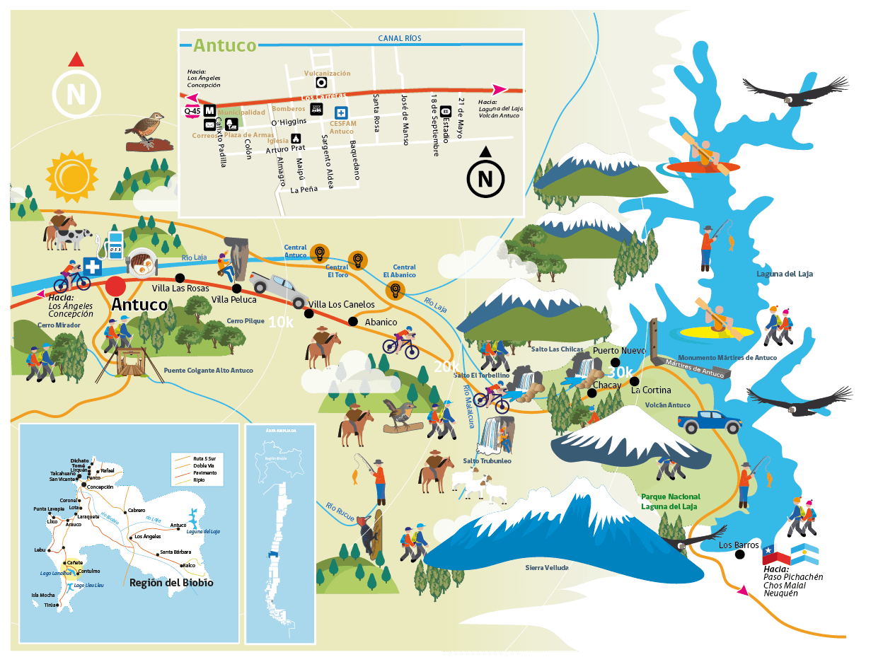 A poco más de 172 km, de Concepción, en dirección a la cordillera, se encuentra Antuco. Comuna que debe su nombre al mapudungún que une las palabras “agua” y “sol”. Cuyo sector tiene la imponente presencia de la Sierra Velluda, punto más alto de la región del Biobío junto con el volcán Antuco, ambas cumbres que coronan cada rincón de la comuna.