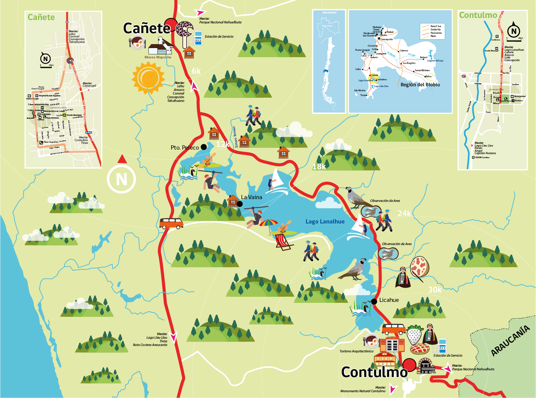¡Junto a la Cordillera de la Costa se encuentra el maravilloso lago Lanalhue! A solo 150 km de Concepción, un lugar que invita a recorrer toda su ribera, donde abunda la flora y fauna nativa. Constituye el primer eslabón de la ruta de los Lagos del sur de Chile, donde podrás ver cisnes de cuello negro, los que hace algunos años llegaron al lago y decidieron hacerlo su hogar.